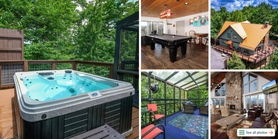 When it’s time to relax, this charming Gatlinburg cabin rental offers 2 fireplaces for cozy nights, a 4-person hot tub on the main deck, spa-like bathrooms, king and queen beds, a nice screened-in porch with seating, and community pool access so you can float around. Within Chalet Village Resort, you’ll also have access to swimming pools, clubhouses with games, fitness equipment, lit tennis courts, and more in summer!