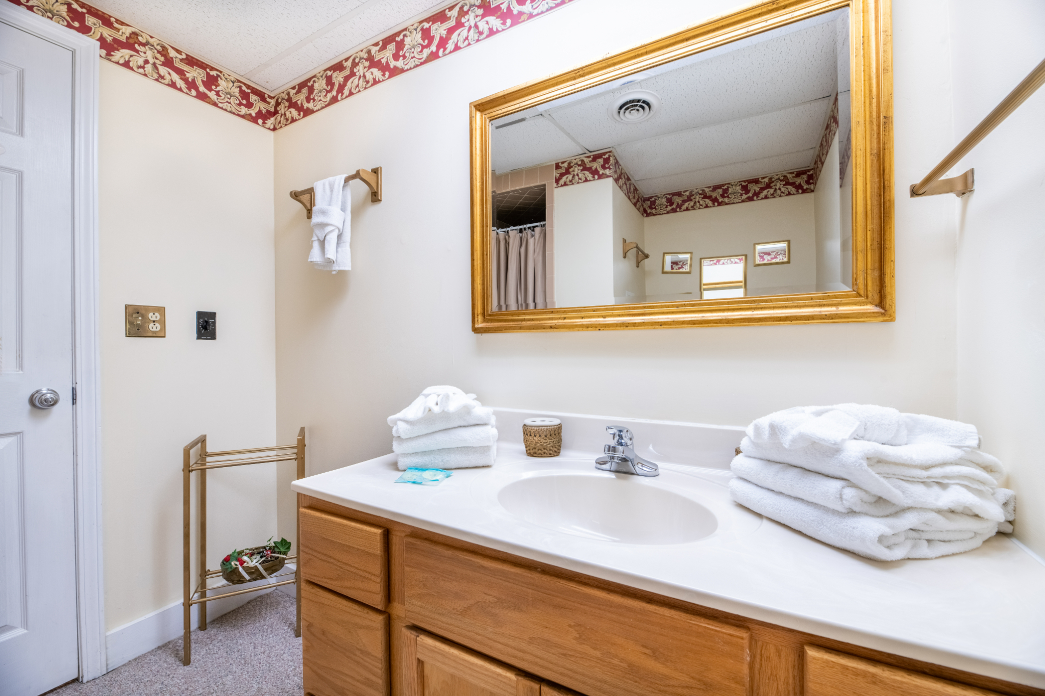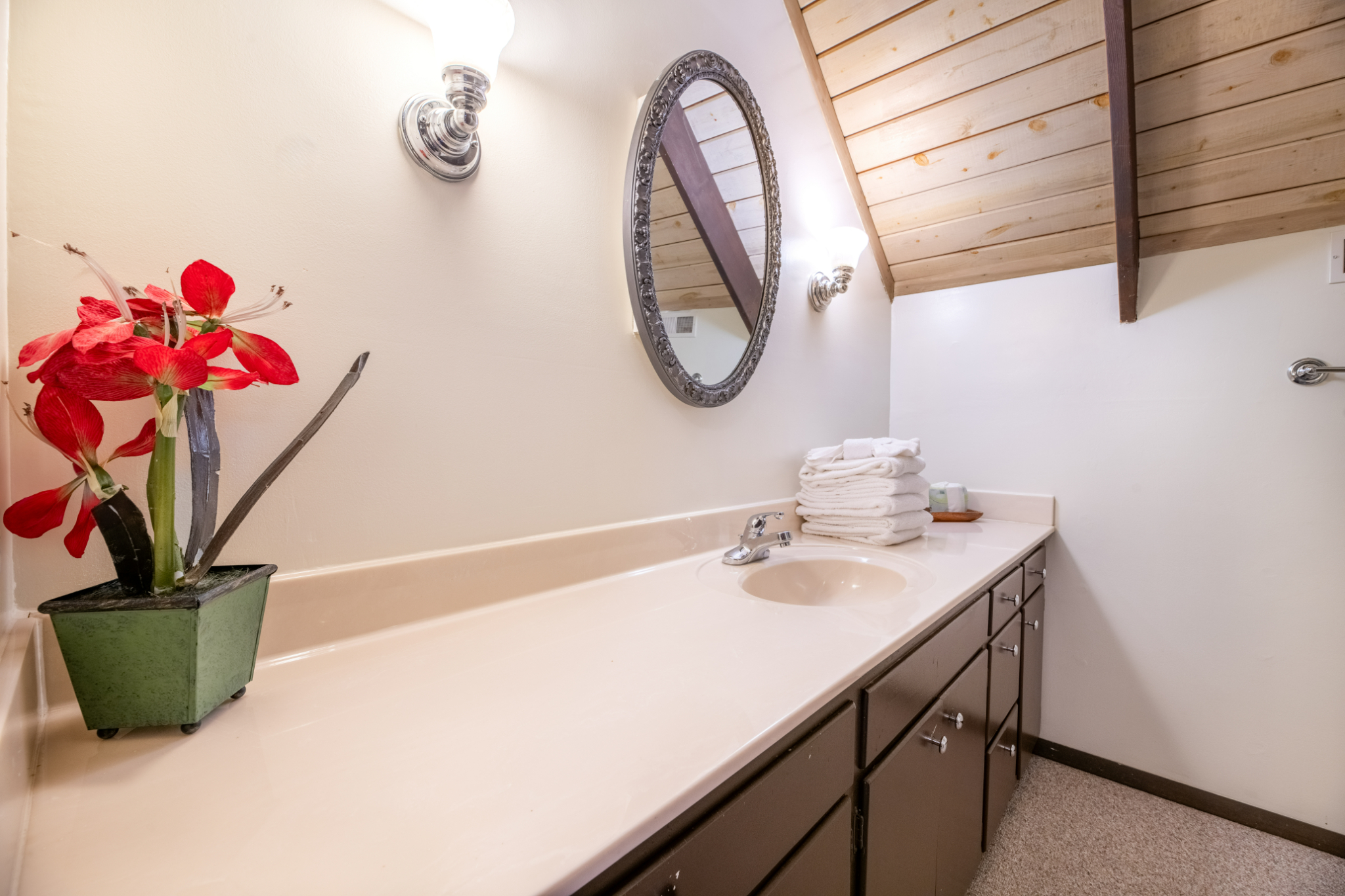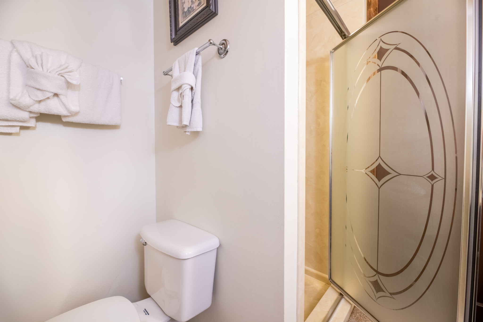 The cabin’s 4 cozy bedrooms offer a mountain retreat from the day’s activities. The primary bedroom on the entry level features a king-size bed, an en-suite bathroom, and a 32-inch flatscreen TV. Upstairs, a bedroom with 2 queen-size beds shares a bathroom (in the landing area) with another bedroom that has a queen-size bed. Downstairs, you’ll find another king bedroom with an en-suite bathroom and TV.