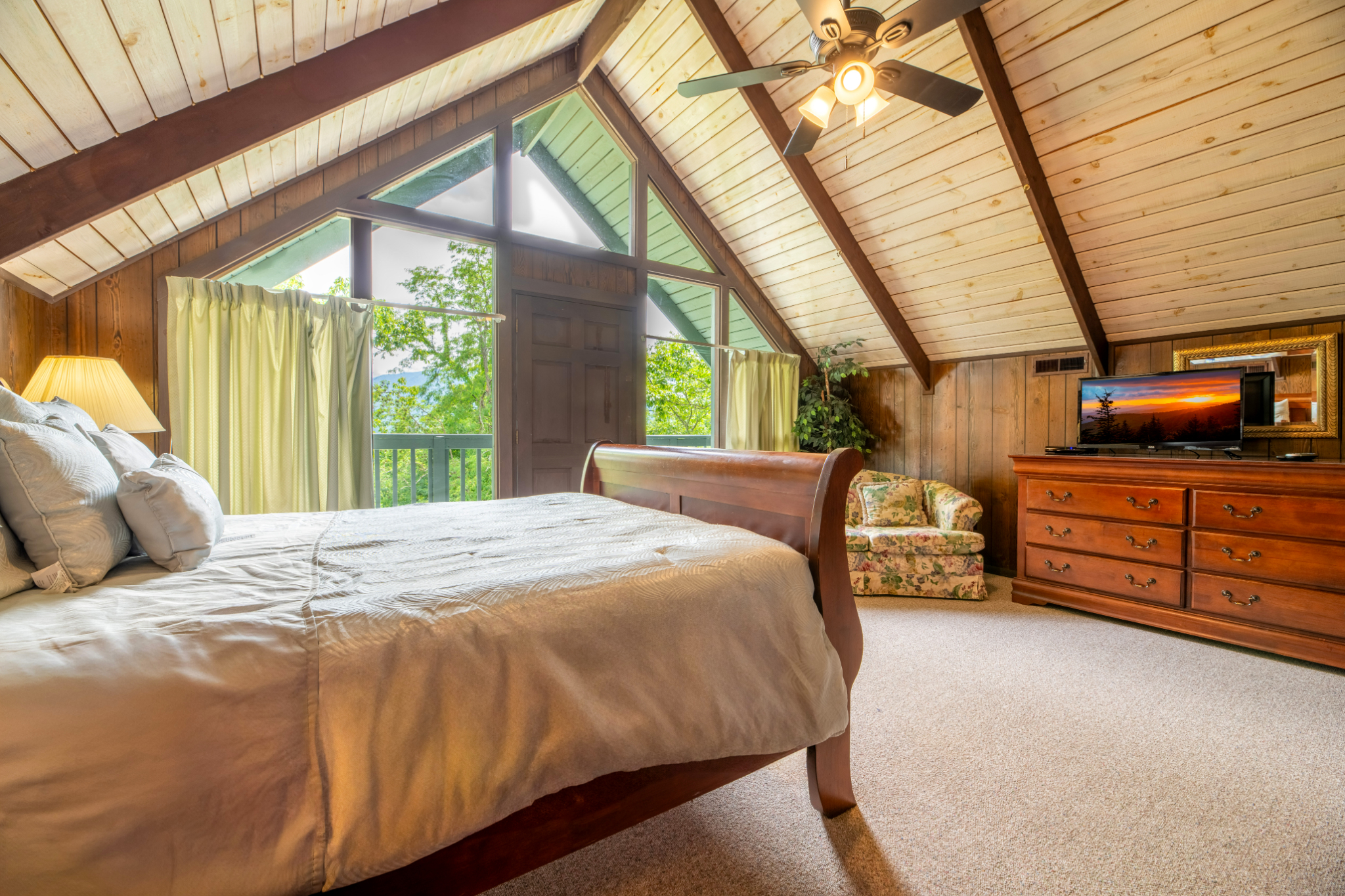 Filling the space with natural light and framing stunning wooded and mountain vistas, this Smoky Mountain cabin rental offers an open living room that beckons relaxation. Ceilings with exposed wood beams, a flatscreen TV, and plush seating create a comfortable spot to relax with friends or family.