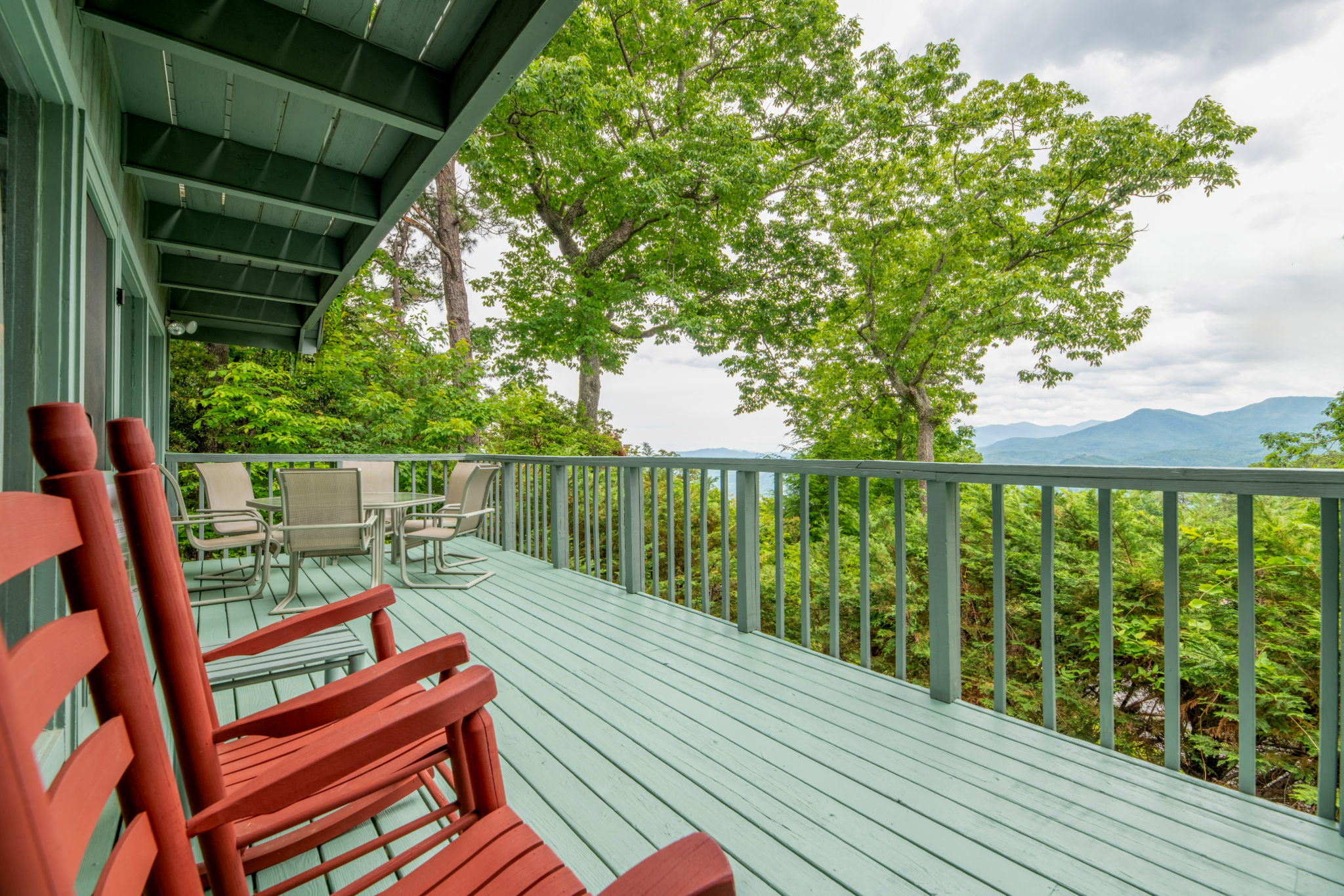The outdoor spaces at this Gatlinburg cabin rental offer endless opportunities to take in the Smoky Mountain scenery. Relax on the main deck, where you’ll find a hot tub, outdoor dining table, and rocking chairs — all with a backdrop of towering trees and mountain views. There’s also a balcony off the upstairs king bedroom!