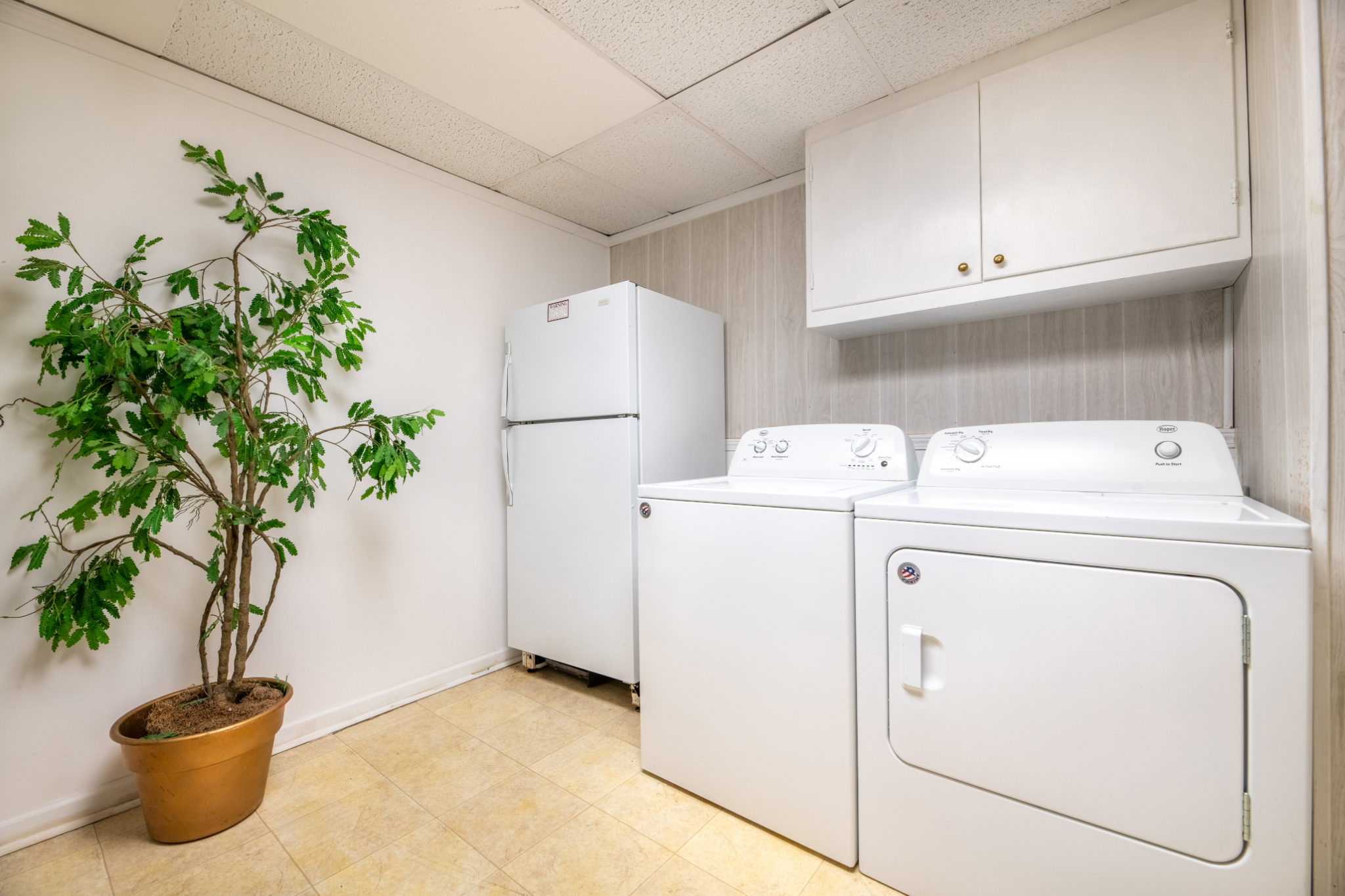 A cozy sitting area provides a place to unwind between games, and there’s even a snack area complete with a microwave, pub table, and sink — ideal for popping popcorn on game night. And you’ll have a full fridge for drinks and frozen treats in the laundry space!