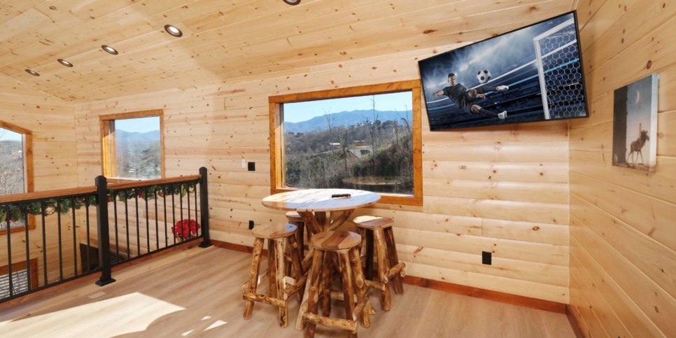 In the primary suite at your Smoky Mountain cabin in Gatlinburg, there’s a king-size bed, access to the main deck, and a garden tub right in the room! Play your favorite podcast or tranquil tunes as you unwind in bath salts or scented bubbles for a while. The second bedroom offers another king-size bed, and you’ll find a twin-over-twin bunk, picture windows, plus a pub table in the loft.