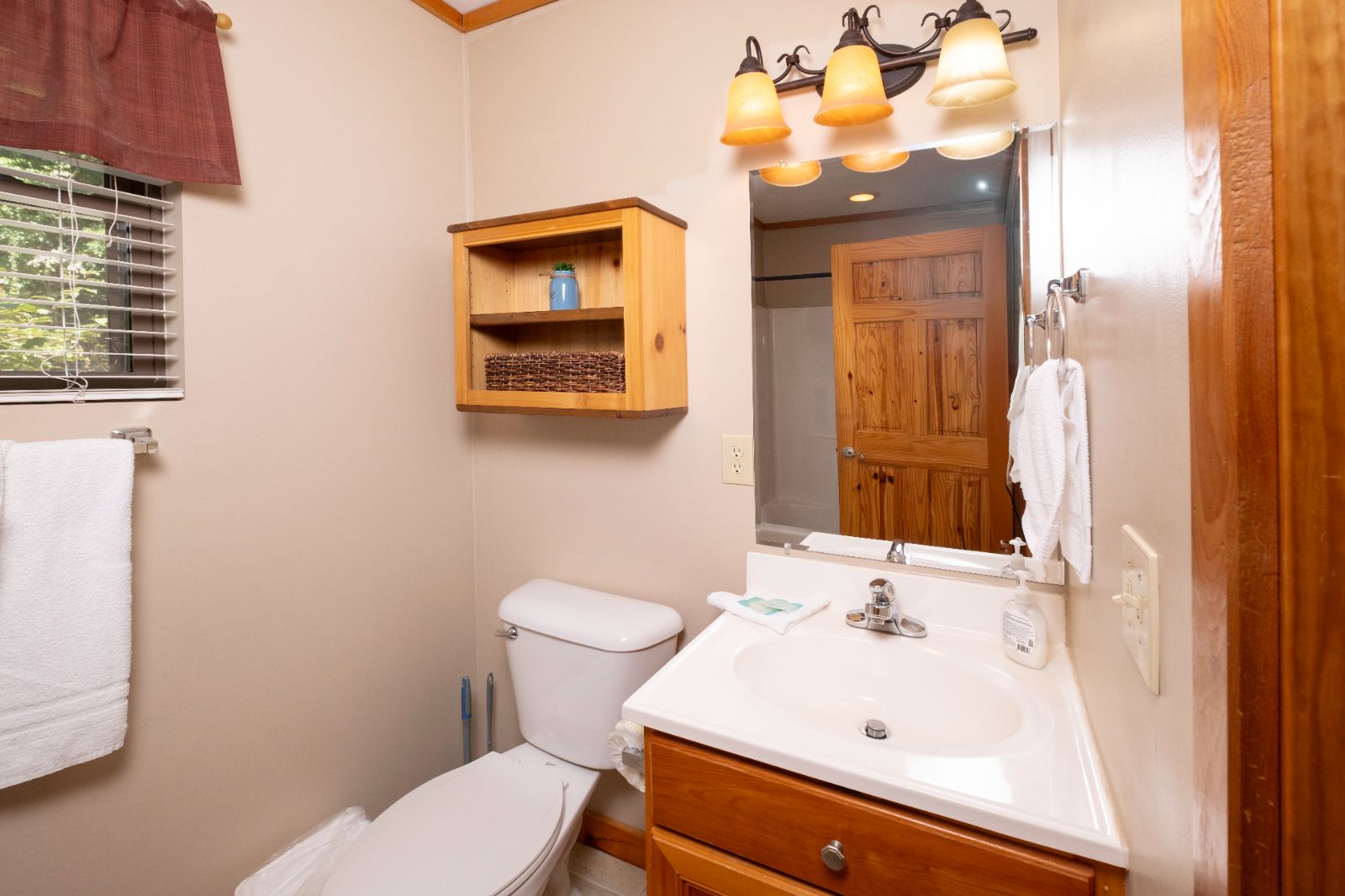 On the lower level, the queen bedroom is near a third full bathroom. Two queen sleeper sofas — one in the living room and one in the rec room — and a fourth full bathroom with another shower/tub combo round out the sleeping space for up to 10 guests at your charming cabin in Gatlinburg, TN.