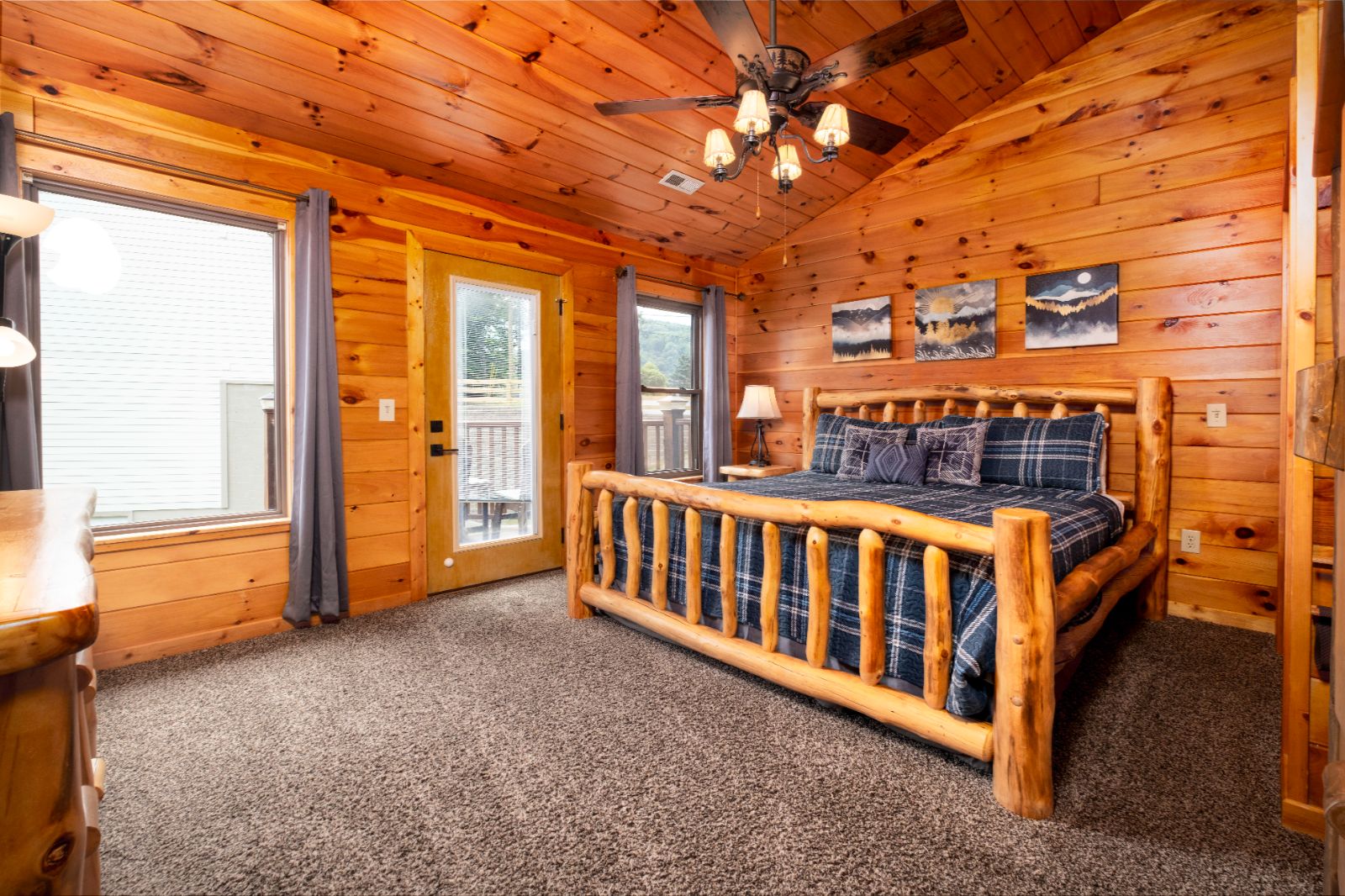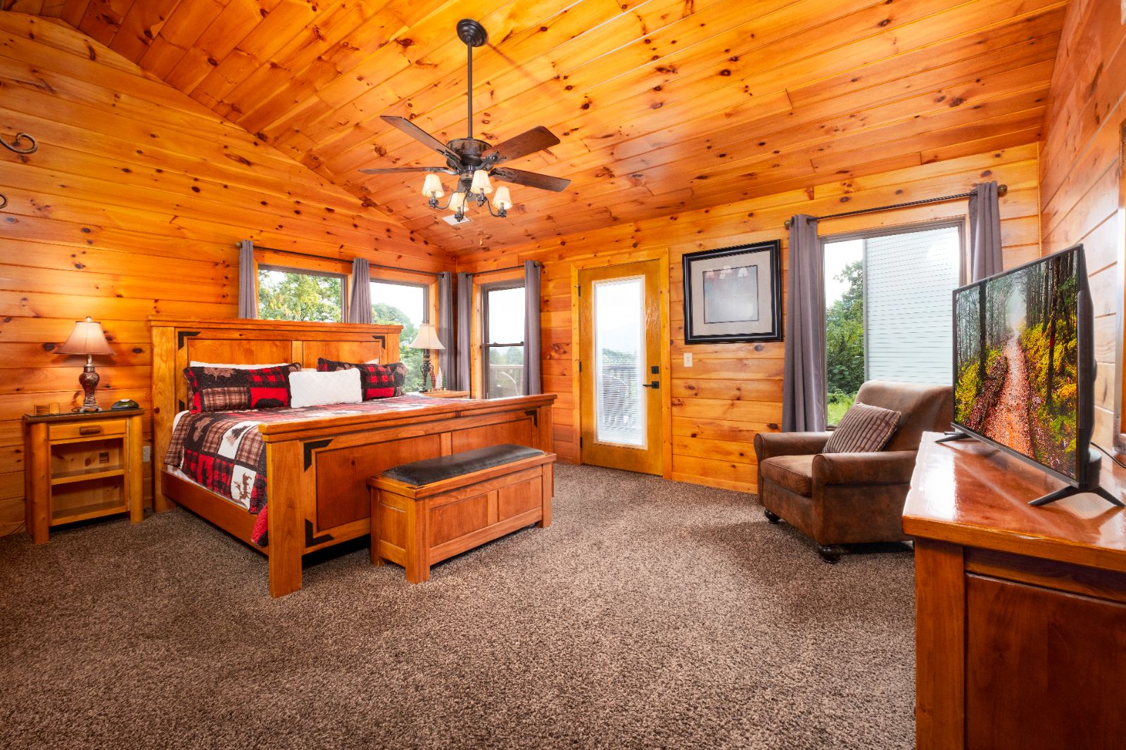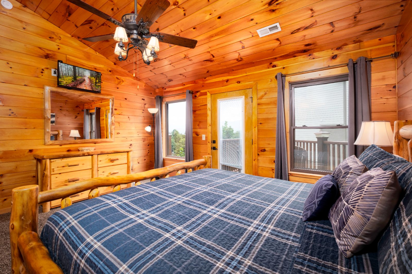 When it’s time to rest after hiking to waterfalls or beating escape games in Gatlinburg, retreat to your 3-bedroom cabin with inviting sleeping spaces with TVs and log furnishings. Two upstairs king bedrooms offer space, privacy, and access to their own private balconies with mountain views. One has a private en-suite with a walk-in shower, while the other shares a hallway bathroom with a shower/tub combo.