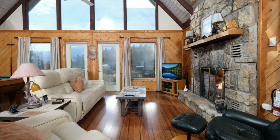Large windows, a stone (gas) fireplace, comfortable seating, a flatscreen TV and DVD player…the living room in Cozy Bear 856 has all you need to unwind in the mountains. Curl up on the plush sofa, crack open a good book in the chairs – with your feet up – and stay warm by the fireplace on cool mountain nights. Sip a glass of wine as you watch a movie here, with popcorn made fresh in the full kitchen nearby.