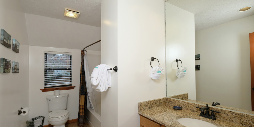 Both bedrooms at this cabin rental in Gatlinburg are tastefully decorated, feature king-size beds, 32-inch flatscreen TVs, and ceiling fans, and are located on different levels for more privacy. When you’re ready for a nap, want to head to bed, or desire to get away for a spell, retreat to your bedroom. You can flip on the bedside lamps to read, turn on the TV for a bit, or cuddle with your partner on the spacious bed.
