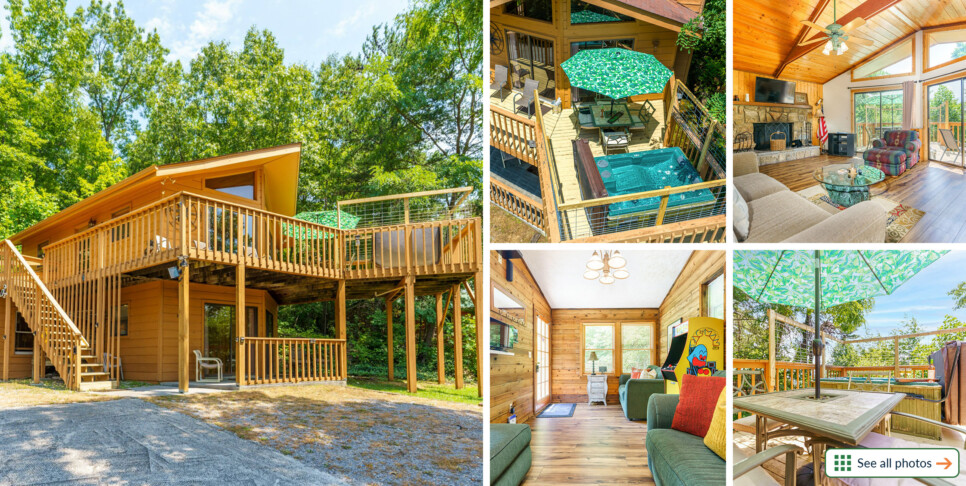Inside, this Gatlinburg vacation home blends cozy cabin aesthetics with modern amenities to ensure a comfortable stay. The spacious living room features a wood-burning fireplace and large windows that frame peaceful wooded views, while the fully equipped kitchen is perfect for whipping up delicious meals after a day of exploring. Entertainment abounds with a Pac-Man arcade machine in the rec area, a hot tub on the deck, and TVs in each bedroom, so everyone can unwind and recharge at their own pace.